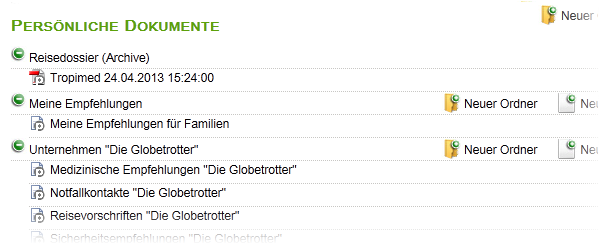 Unter der Rubrik «Persönliche Dokumente» kann der Benutzer eigene Informationen in Tropimed zusammenstellen oder importieren. Hier erscheinen die vom Benutzer im Ordner «Reisedossier» gespeicherten Dokumente mit Datum und Uhrzeit der Erstellung.